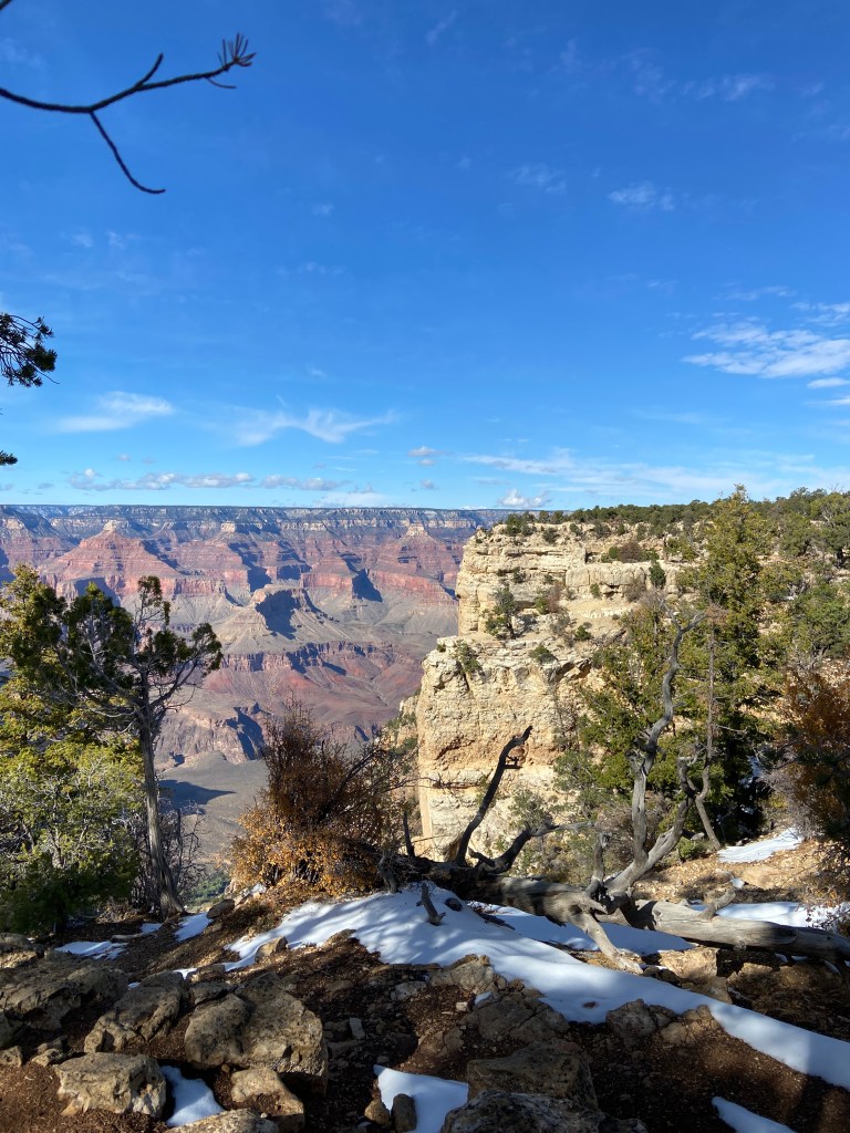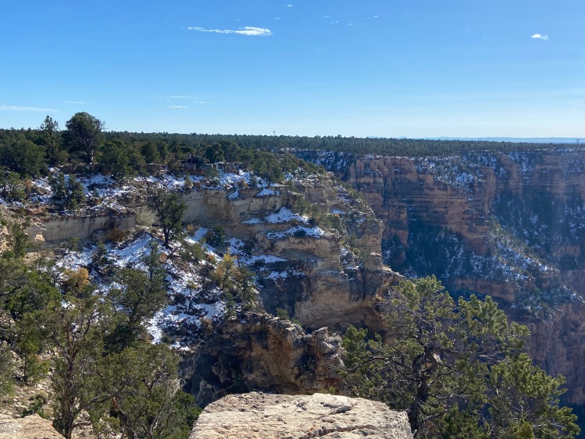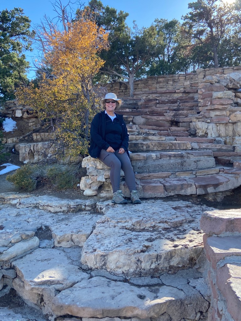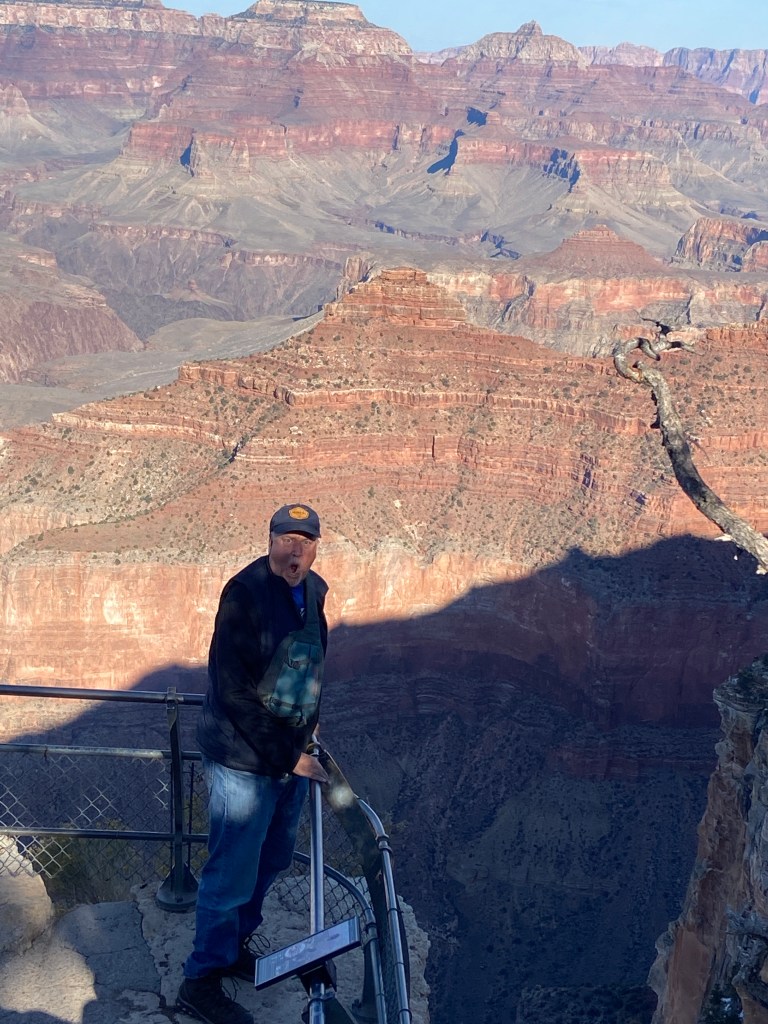 After an hour long wait in line to enter the Grand Canyon National Park, we arrived at our camp site in Trailer Village. We ate a quick lunch and then practically ran to the rim trail. Ed kept saying “slow down” but I could not stand the wait any longer. My first look was everything I had imagined and more. The grandeur was breathtaking and moved me to tears. This response has happened to me a few other times, when first viewing Monet’s water lilies, and when being caught by surprise of the magnificence of Klempt’s ”The Kiss”. This time though, it was God’s work, and he out did himself. We walked a four mile loop from the campsite along the rim trail and each view was as impressive as the next. It had snowed the night before and the temperatures remained chilly enough that the snow in the woods at our campsite did not melt. The Outland Firepit came in handy as wood fires are not allowed here. It was the perfect setting for a celebratory drink!