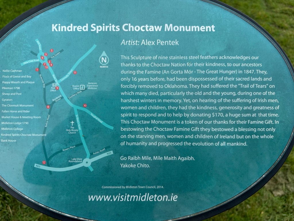 As we left the town of Midleton we stopped by the Kindred Spirit Monument dedicated to the Choctaw Tribe for their kindness towards the people of Midleton during the Potato Famine. Take a minute to read the words on the placard. They moved my soul.