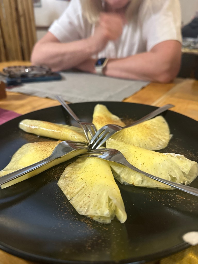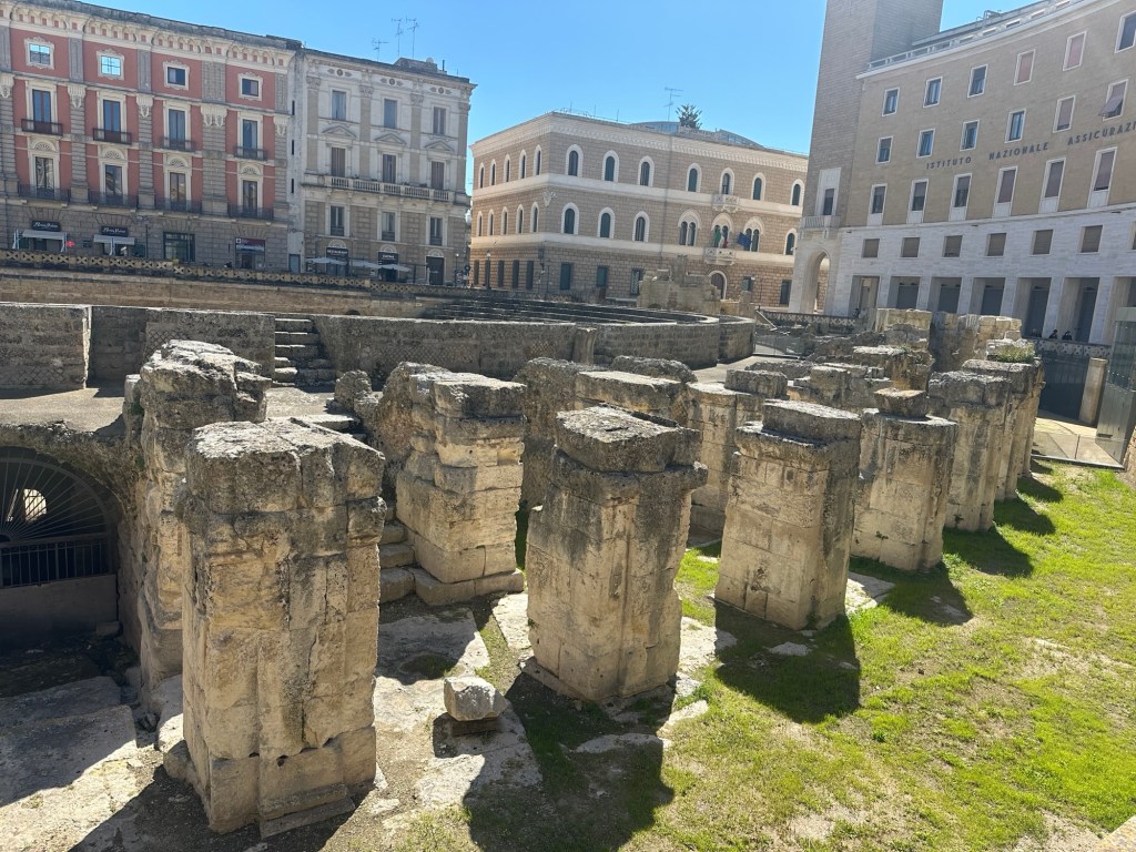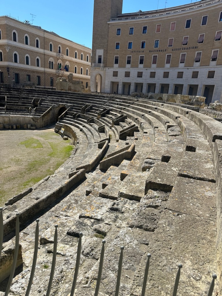 My first cup of cappuccino😋The view from the rooftop terrace was stunning. Though we had a bluebird blue sky day, it was still a little nippy to dine alfresco.Then it was off to celebrate Easter. Buona Pasqua!! We actually attended the Easter Mass at the Duomo and thought it was all in Italian and Latin, we could follow along because of the liturgy.Then it was out through the city gates to have a wonderful Easter lunch along the wall of the historic city center. We dined at Oysteria 203 and it was both delicious and fun as the wait staff was so engaging.Swordfish accompanied with smoked stracciatella and tomato relish.Pineapple Ravioli. We thought it would be pasta with a pineapple filling but the paper thin sliced pineapple was the shell filled with Chantilly Cream. The amphitheater, still being excavated.We arrived at the Masseria and it is amazing! We had too much fun enjoying a beautiful Easter afternoon to take a lot of pictures, but our home for the week, located between Carovigno and Ostuni, is just perfect.