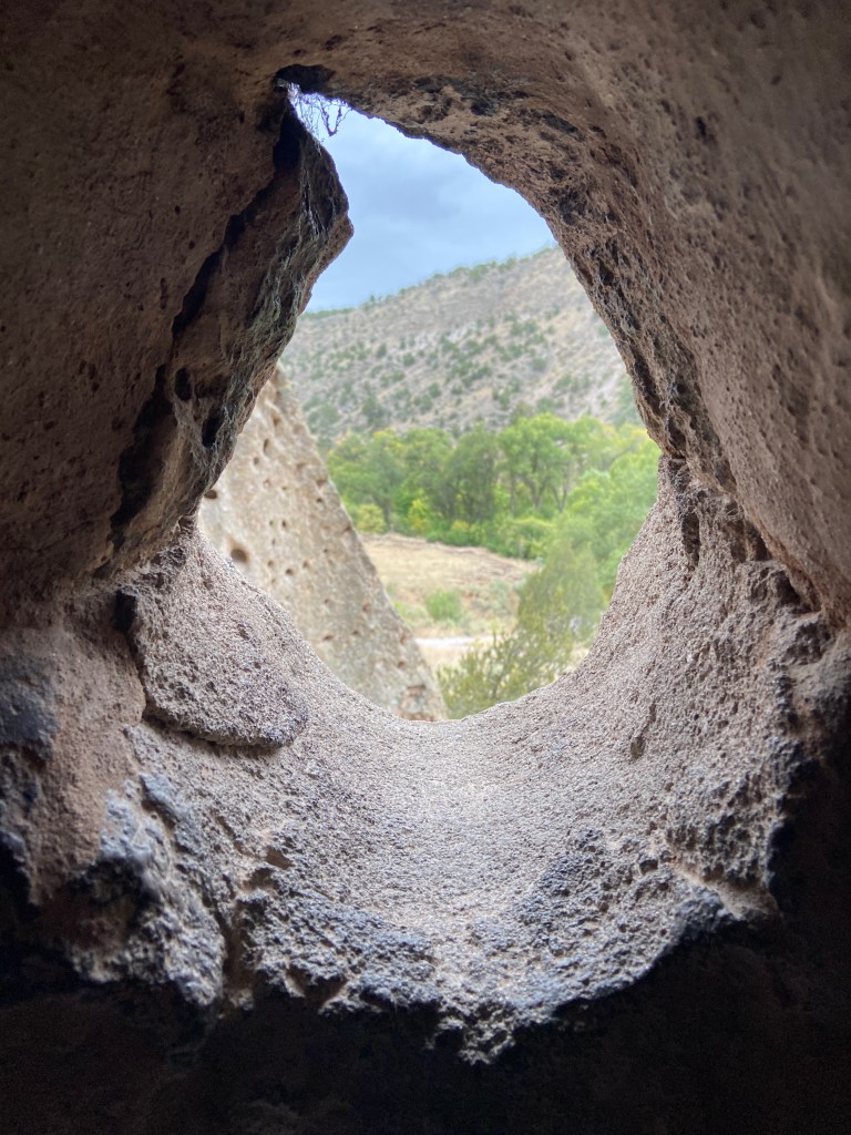 Imagine the wonder of the Ancestral Pueblo People when they discovered the lush Frijoles Canyon, teeming with wildlife, trees, a creek running through it, and the canyon wall made up of soft “tuff” easily carved out into shelters. What a spiritual, magical place to visit. You get a real feel for life here in the early 1200s. Walking through the base of the canyon you could just imagine the children playing in the forest. We did not climb the 140 feet collection of steps and ladders to reach the Alcove House because it had started raining and we were worried about slippery footing. (That’s my excuse and I’m sticking with it!) I hope we will return some day!